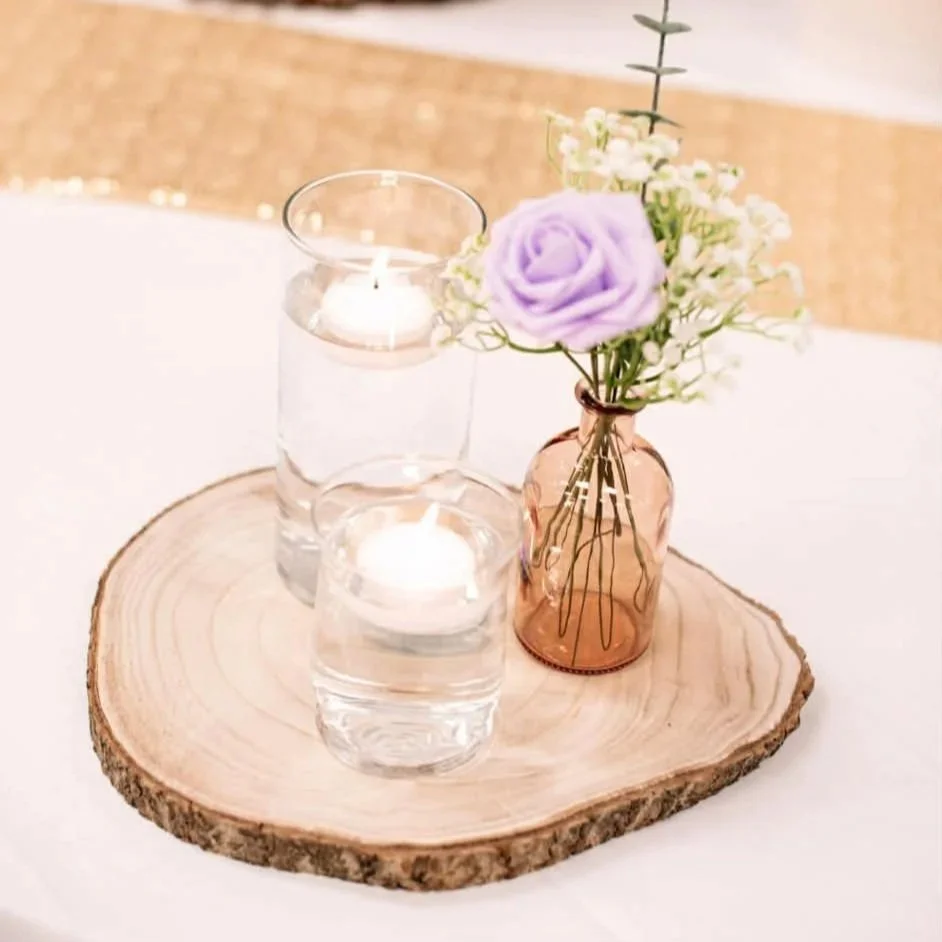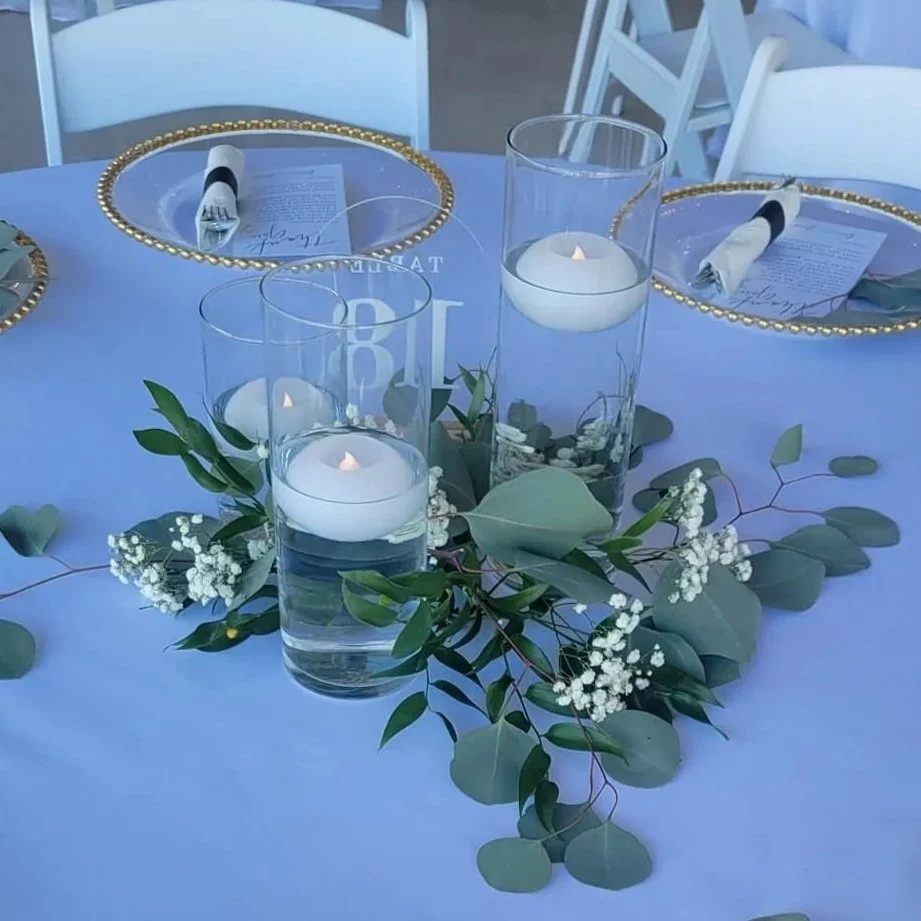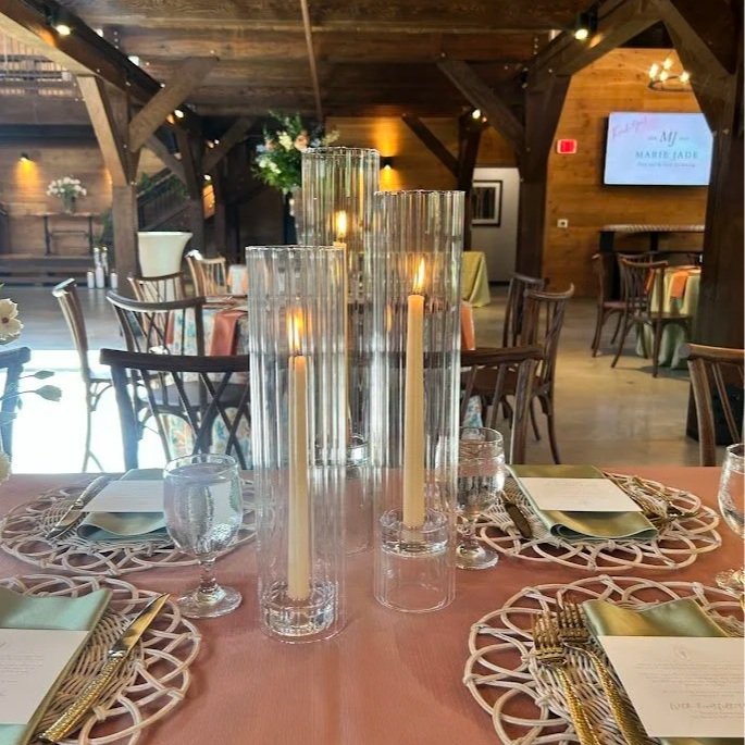 A simple and elegant 3-tiered table décor design suitable for up to 15 reception tables. This tiered look features a combination of complementary décor elements, which may include candles, vases, light greenery, and a table number. The arrangement creates visual interest while maintaining a clean, minimal aesthetic that works well with a variety of event styles.