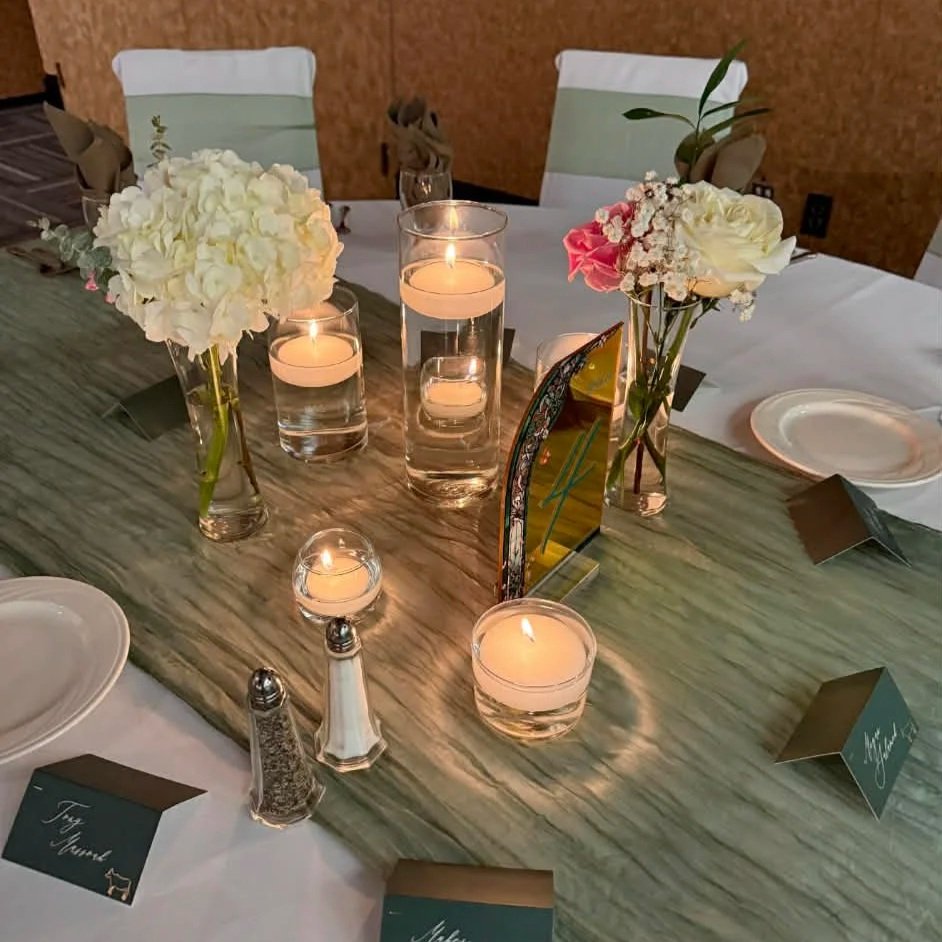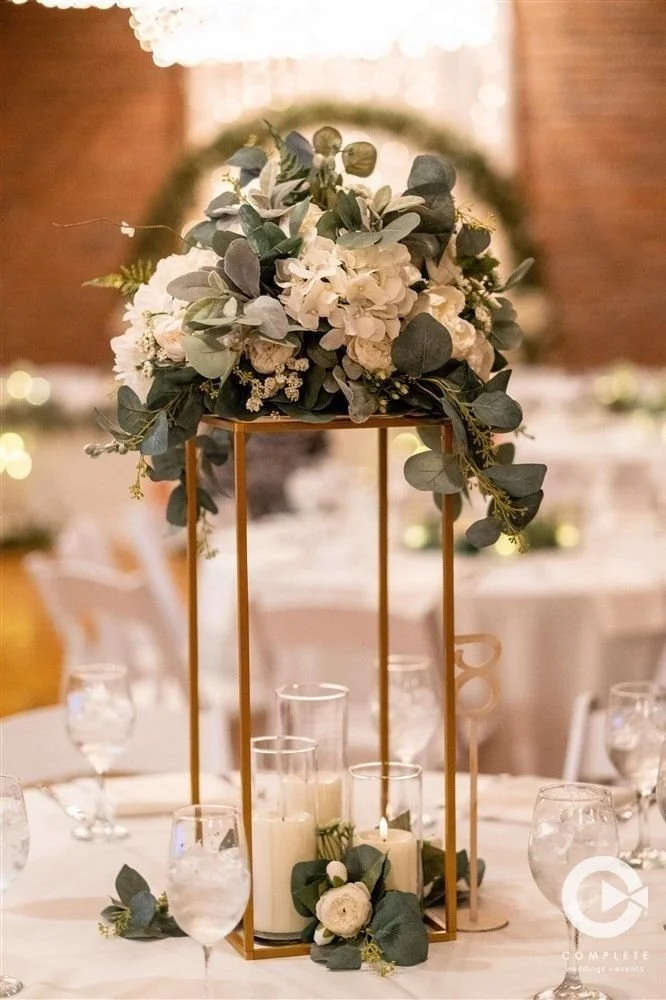 A fully styled, statement-making table décor package designed to stand out. This package features larger and taller display pieces along with multiple table elements, including chargers, runners, candles, vases, and table numbers. Ideal for those who prefer a grander table design with elevated detail and visual impact.